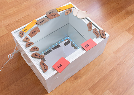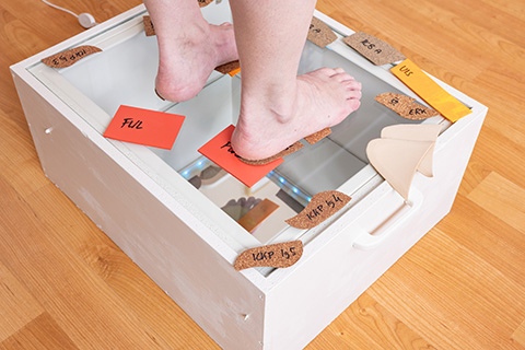 - Anpassung von maßgefertigten Einlagen, bei der die podologischen Einlageelemente direkt am Podoskop (Fußspiegel) unter die Füße gelegt werden und die Reaktion auf die Füße und den restlichen Körper überprüft wird.